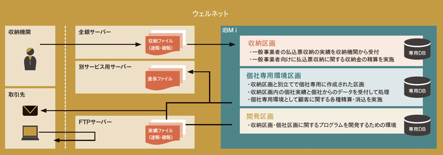 現在は、IBM i上で3つの区画を運用している。1つ目の区画では前述したコンビニ収納代行システムが稼働し、2つ目の区画では、顧客と密接に連携する個社専用システムが稼働している。そして3つ目は開発区画である(図表1)。