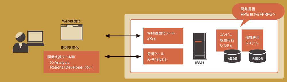 ここまでがサービス開発部に向けた内容であるのに対し、一般ユーザーに向けた業務効率化案としては、ユーザー・インターフェースを改善し、これまでのように5250画面ではなく、Web画面での操作を可能にする。そのために、5250画面のWeb変換ツールである「aXes」(ランサ・ジャパン、フェアディンカム)を導入する。