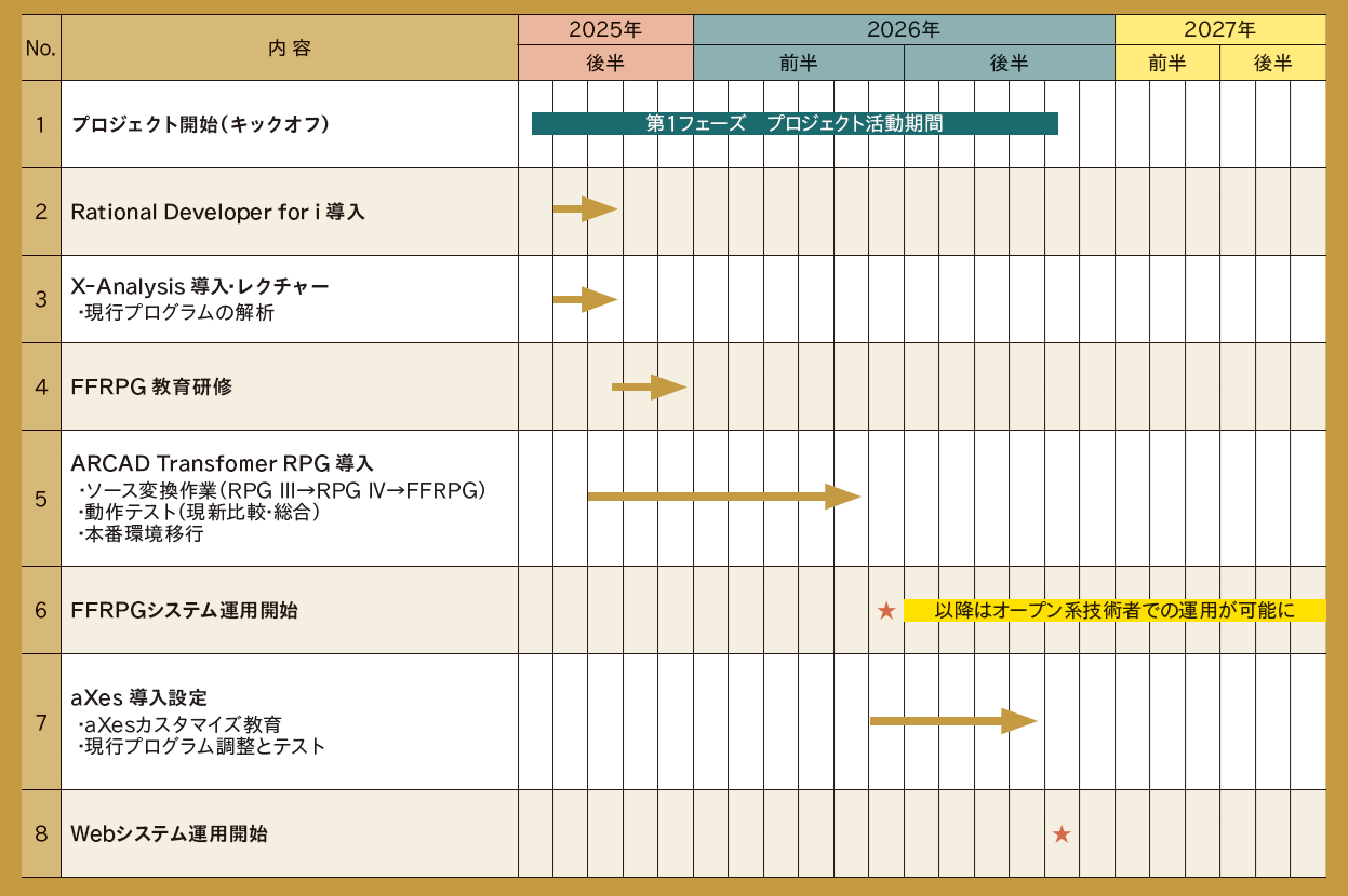 さらにaXesによる5250画面からWeb画面への変換は、今年6月から約5カ月をかけて実施する。カスタマイズ教育と変換後のプログラム調整およびテストを経て、今年11月からの本稼働を予定している。