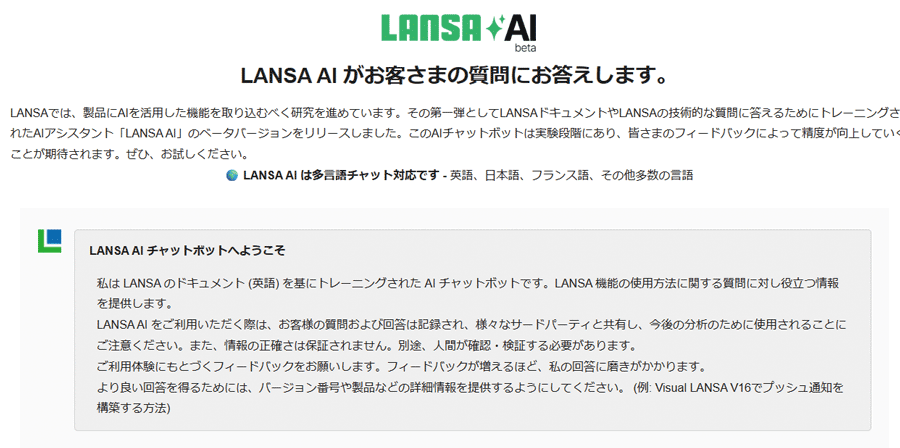 ランサ・ジャパンは2025年7月、AIチャットボットである「LANSA AI」のベータ版をリリースした。
