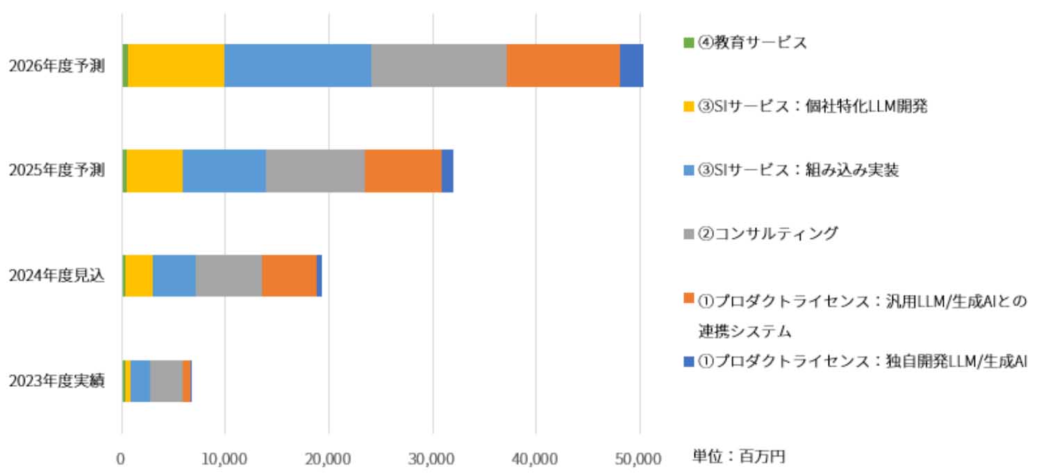 の比率だが、2024年度はRAG(検索拡張生成)により汎用LLM・生成AI向けの「個社特化LLM開発」が急伸し、「SIサービス」と「コンサルティング」の比率が逆転する予測している。