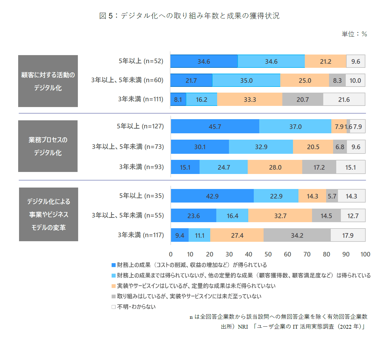 その結果、「業務プロセスのデジタル化」では5年以上取り組んでいる企業の割合が39.3%であるのに対し、「顧客に対する活動のデジタル化」と「デジタル化による事業やビジネスモデルの変革」ではそれぞれ16.3%、10.7%にとどまった。