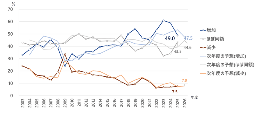 2025年度に、自社のIT予算が前年度と比べ増加したと回答した企業は49.0%であった(図表1)。