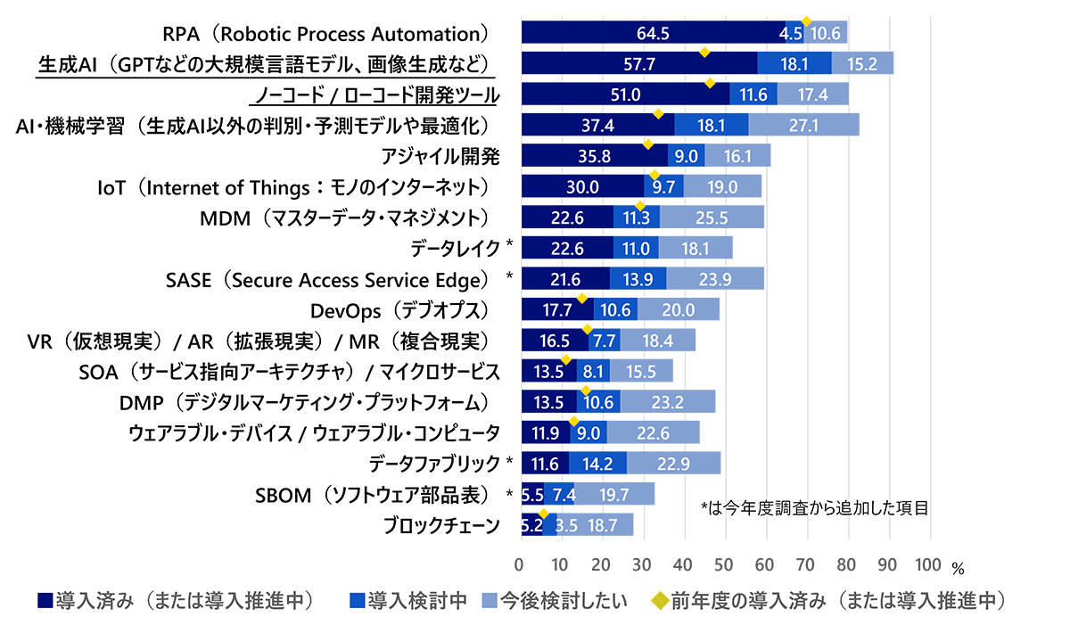 またソースコードを書かないか、または最小限の記述でプログラム開発を行う「ノーコード/ローコード開発」の導入率は2024年度から4.9ポイント伸びて51.0%となった。システム開発の効率化や、専門知識がないユーザーが自ら開発を行う市民開発における利用が拡大していると推測される。