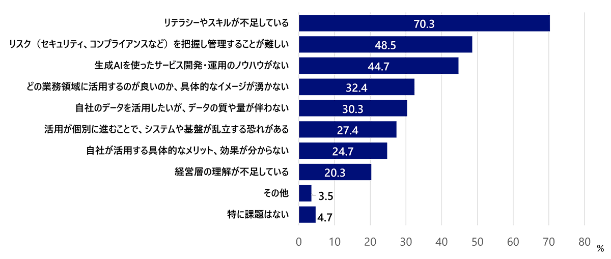 生成AIの活用に関わる課題をたずねたところ、最も多く挙げられたのは「リテラシーやスキルが不足している」で、70.3%であった(図表3)。
