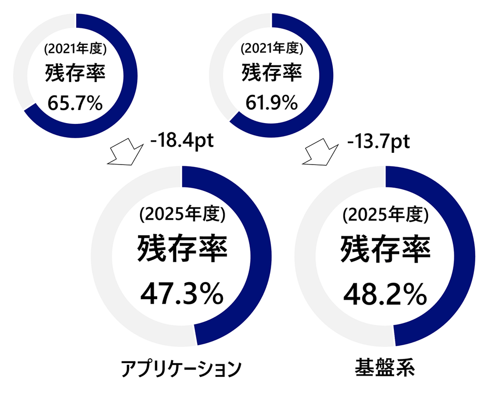 2021年度調査と比較すると、アプリケーションは18.4ポイント、基盤系は13.7ポイント減少したものの、約半数の企業では依然としてレガシーシステムが残存している状況である。
