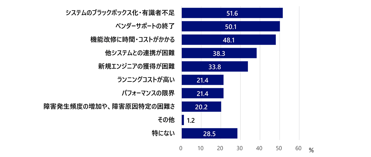 また、レガシーシステムを継続利用する際の懸念や課題についてたずねたところ、「システムのブラックボックス化や有識者の不足」を挙げた企業が51.6%、「ベンダーサポートの終了」が50.1%という結果になった(図表5)。