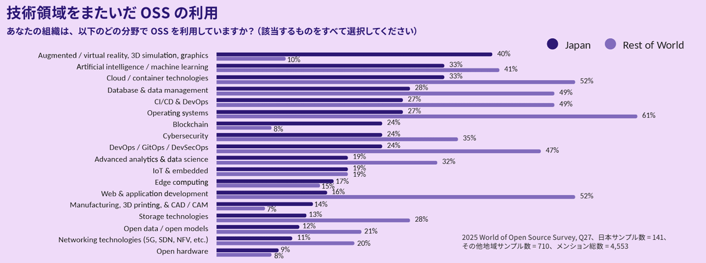 一方、図表1は日本が専門的なアプリケーション分野におけるOSSの採用において優れていることを示している。具体的には、視覚技術(拡張現実/仮想現実、3Dシミュレーション、グラフィックス)では40% vs. 10%、ブロックチェーンでは24% vs. 8%、製造技術(製造、3Dプリンティング、CAD/CAM)では14% vs. 7%となっている。