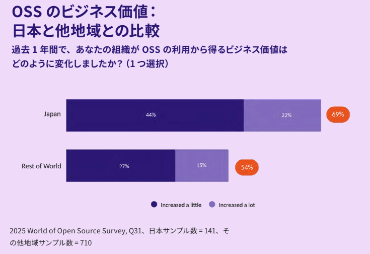 基盤インフラの導入が遅れているにもかかわらず、日本企業はオープンソースから得られるビジネス価値の認識において、世界の他の企業よりも高い伸びを示している。