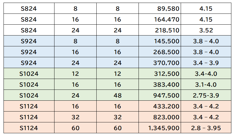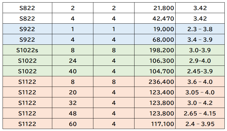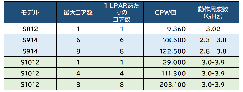 これによると、S1022s 8コアとS1122 8コアのCPW値は、それぞれ19万8200CPWと23万6400CPWで約1.2倍、また40コアのE980とE1180は、それぞれ61万1300CPWと104万9100CPWで約1.7倍のパフォーマンス向上がある。