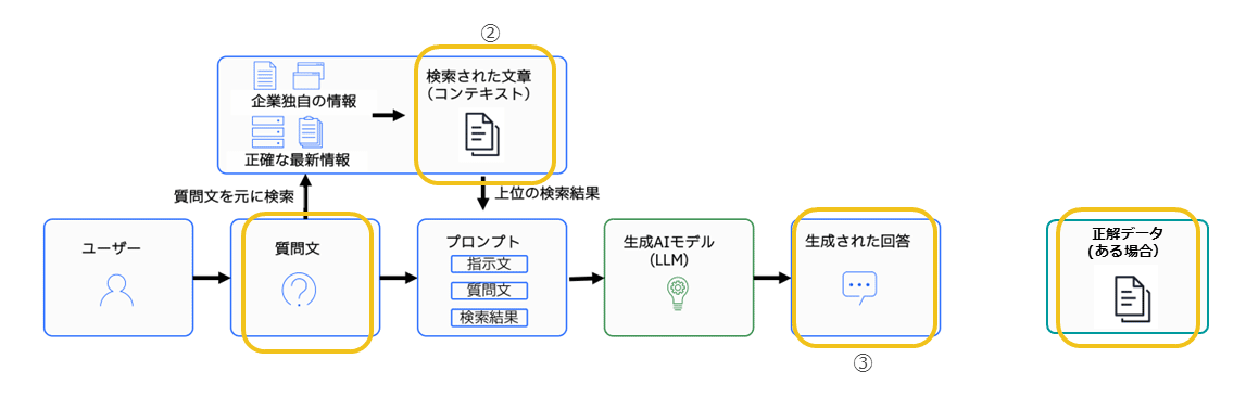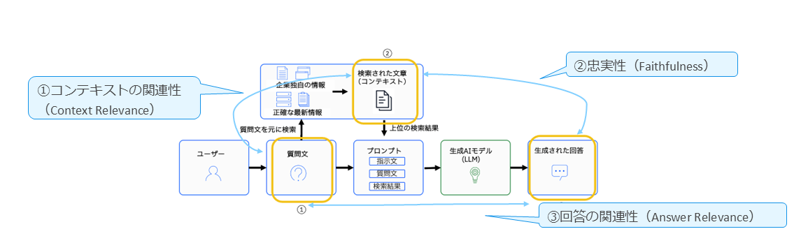 具体的には、まずユーザーのクエリーとして与えられる質問文、次に検索によって取得された文書(コンテキスト)、そしてシステムが生成した回答が評価対象となる。