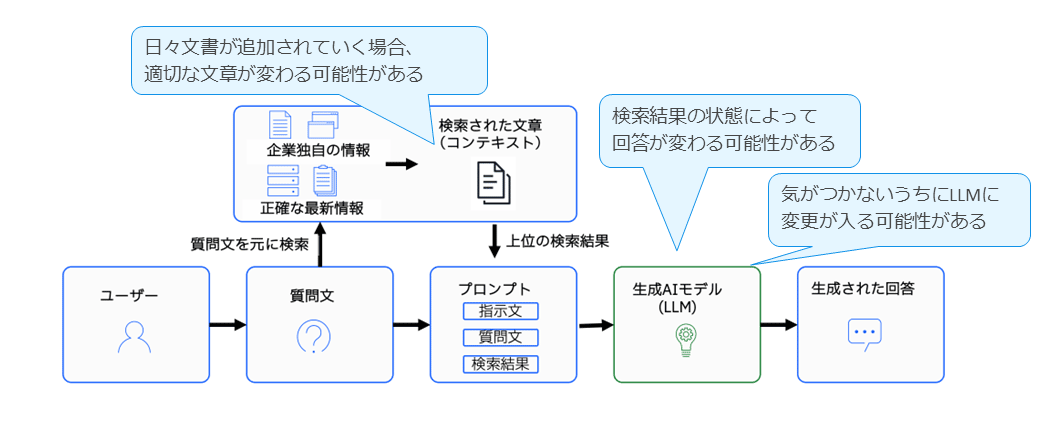 RAG は日々更新される文書を参照する仕組みであるため、検索結果やモデルの更新によって生成される回答が変動する可能性がある。このような性質から、システムが正確に動作しているかを定量的に確認する評価が重要となる。