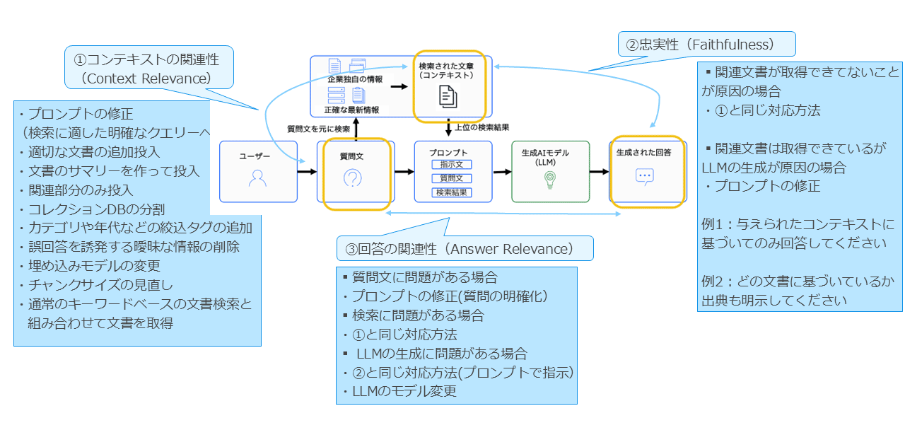以上のように、回答の関連性が低い場合には、質問文、検索過程、生成過程の3つの観点から原因を分析し、それぞれに応じた適切な対策を講じることが重要となる。