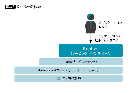 一方、KubernetesのエコシステムにServerlessワークロードを持ち込むためのコンポーネントセットを提供するKnativeも注目されている(図表2)。