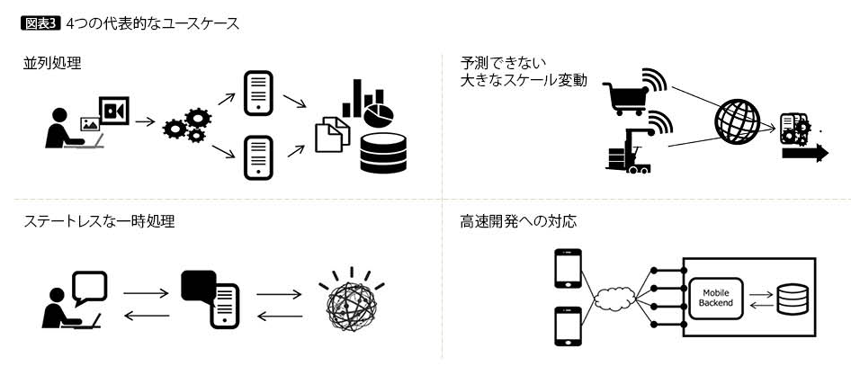 CNCFのホワイトペーパーでは、Serverlessの代表的なユースケースを整理している。そこで紹介されているのが「並列処理」「予測できない大きなスケール変動」「ステートレスな一時処理」「高速開発への対応」の4つである(図表3)。順に説明する。
