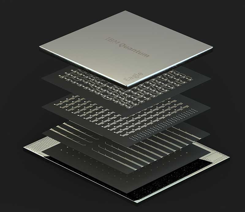 Eagleプロセッサは、多層配線と基盤間を貫通電極で繋ぐ技術が使われ、高密度の3次元実装(3D packaging)により実現された。どちらも、室温で使われる通常の半導体では以前より使われていた技術であるが、これを極低温で動作する超電導量子コンピュータに適応させたことに、大きな技術的革新がある。IBM基礎研究所では、長年にわたる半導体技術、およびその実装技術の研究開発に多くの経験と実績があり、それらを総動員しての実現と言える。