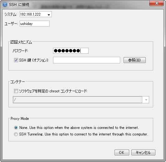 [システム:]、[ユーザー:]、[パスワード:]、必要であれば[SSH 鍵(オプション)]を適宜入力し、[OK]ボタンをクリックします。